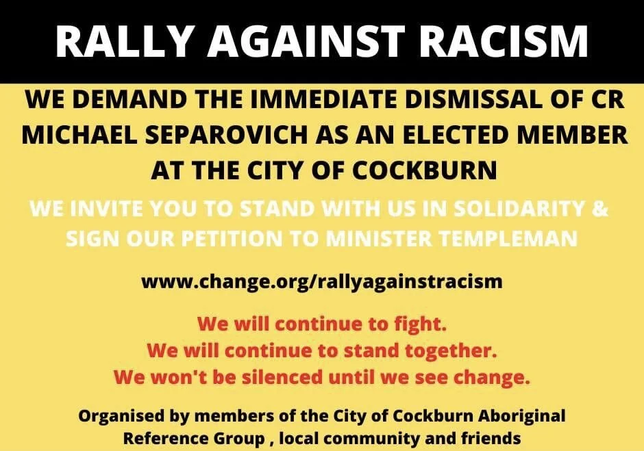 Rally Against Racism is a campaign supporting Noongar mob in their fight against a racist Councillor named Michael Separovich that currently holds office as an Elected Member of the City of Cockburn Council.