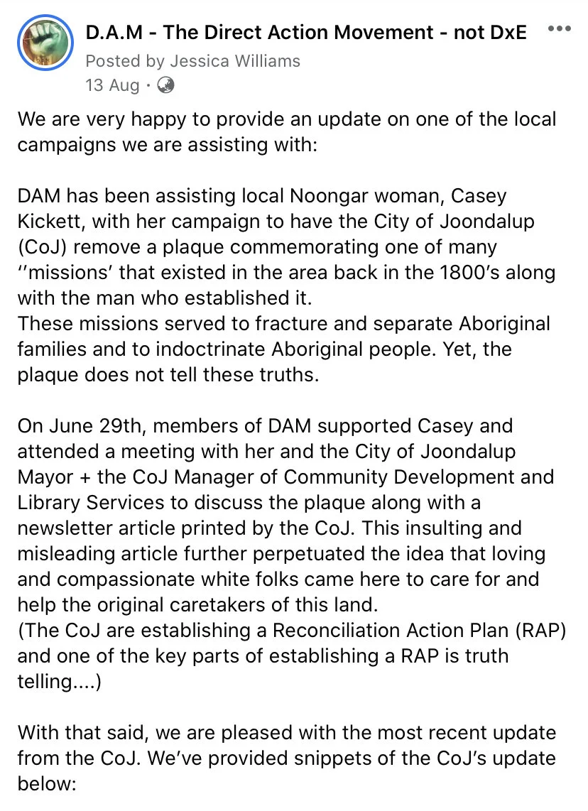 We are assisting local Noongar woman and activist Casey Kickett with her campaign to see a plaque, glorifying one of many ‘missions’ across WA, located in Joondalup to be removed and replaced with artwork and a memorial designed and decided upon by local Noongar elders. These missions served as centres to gather stolen Aboriginal children in an effort to condition them into believing white man’s religion and using our language. Many children were sent to the homes of rich Australians to be servants. At this specific location in Joondalup, it is believed, and data supports that belief, that there are numerous Aboriginal children buried in unmarked graves. These children passed away from illness, or at least, that’s what the little amount of information we have suggests.