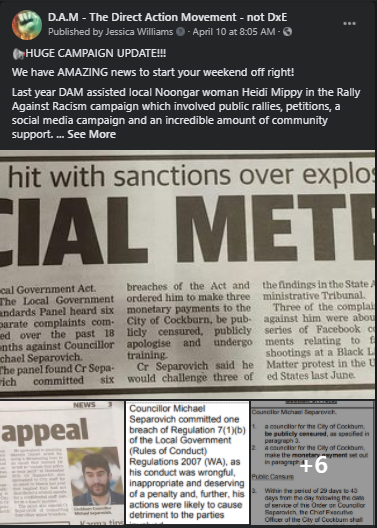 DAM is conducting a survey to gather data on the impact of this Councillors language and actions, we are assisting with planning and organising rallies and we are working diligently behind the scenes to gather necessary information for the complex complaint process that must be followed in order to hopefully see the Director General of the Department of Local Government recommend to WA Minister for Local Gov. David Templeman for this Councillor to be removed.